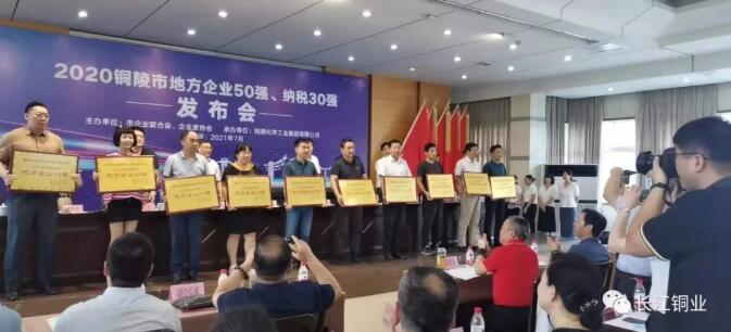 2021年7月6日下午,由市企業(yè)聯(lián)合會、市經(jīng)信局、市稅務(wù)局聯(lián)合舉辦的2020年度銅陵市“地方企業(yè)50強(qiáng)”“納稅30強(qiáng)”發(fā)布會在銅化集團(tuán)會議室隆重召開。副市長王綱根,市老領(lǐng)導(dǎo)、市“四會”創(chuàng)始會長唐世定,市委宣傳部副部長章祎,市中小企業(yè)局局長朱永平,市稅務(wù)局黨委委員、副局長李軍等領(lǐng)導(dǎo)出席會議。發(fā)布會上,我司被授予“2020年度銅陵市地方企業(yè)50強(qiáng)”的榮譽稱號!