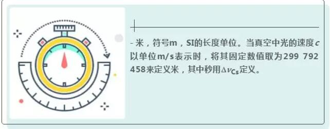 - 米,符號m,SI的長度單位。當真空中光的速度c以單位m/s表示時,將其固定數(shù)值取為299 792 458來定義米,其中秒用DnCs定義。