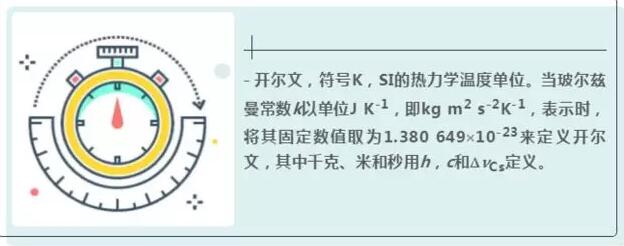- 開爾文,符號K,SI的熱力學溫度單位。當玻爾茲曼常數(shù)k以單位J K-1,即kg m2 s-2K-1,表示時,將其固定數(shù)值取為1.380 649′10-23來定義開爾文,其中千克、米和秒用h,c和DnCs定義。